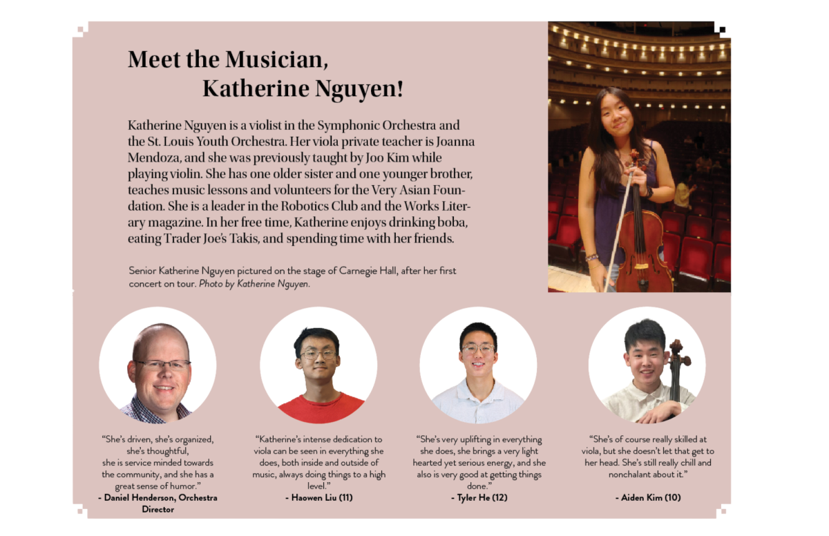 The violist, senior Katherine Nguyen, joined the National Youth Orchestra this summer for a global tour with the nation’s top youth musicians. During the tour, Nguyen was one of two students representing the state of Missouri.